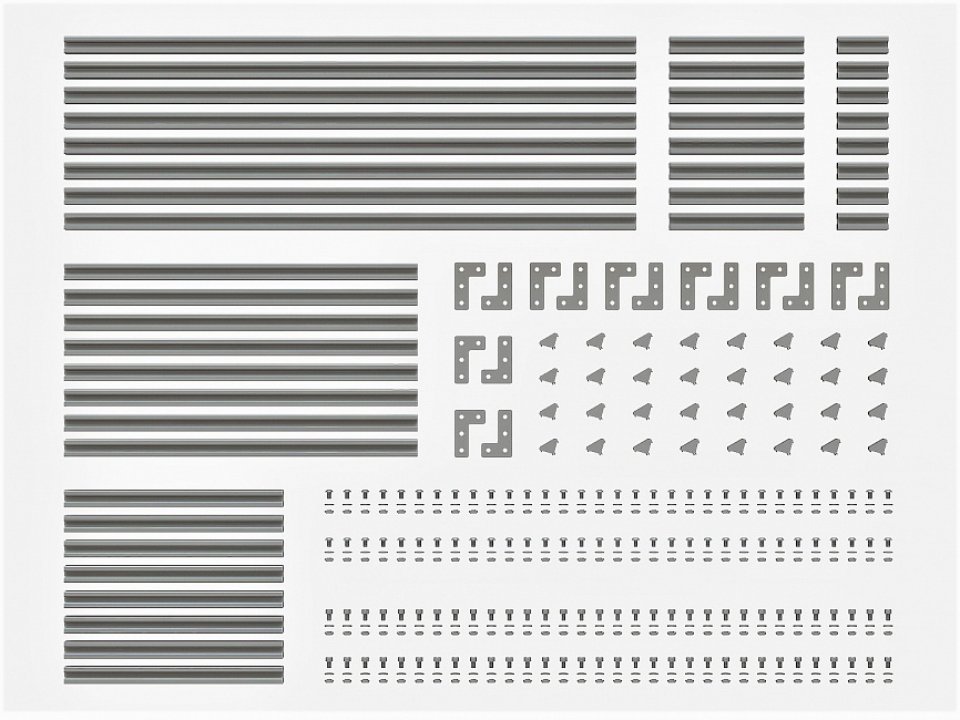 Набор состоит из алюминиевого профиля разной длины и крепежа, что позволяет создавать различные конструкции. Набор легко собирать и разбирать, поэтому заменить часть конструкции или полностью переделать ее не составит большого труда. Набор подойдет как для новичков, так и для опытных инженеров. Покупка набора выгодней на 10%.