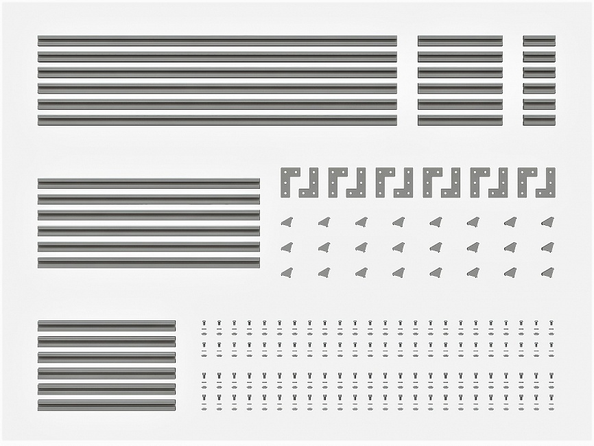 Набор состоит из алюминиевого профиля разной длины и крепежа, что позволяет создавать различные конструкции. Набор легко собирать и разбирать, поэтому заменить часть конструкции или полностью переделать ее не составит большого труда. Набор подойдет как для новичков, так и для опытных инженеров. Покупка набора выгодней на 10%.