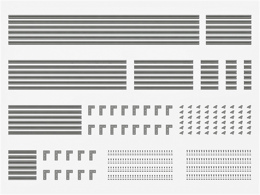 Набор состоит из алюминиевого профиля разной длины и крепежа, что позволяет создавать различные конструкции. Набор легко собирать и разбирать, поэтому заменить часть конструкции или полностью переделать ее не составит большого труда. Набор подойдет как для новичков, так и для опытных инженеров. Покупка набора выгодней на 10%.