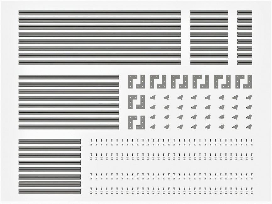 Набор состоит из алюминиевого профиля разной длины и крепежа, что позволяет создавать различные конструкции. Набор легко собирать и разбирать, поэтому заменить часть конструкции или полностью переделать ее не составит большого труда. Набор подойдет как для новичков, так и для опытных инженеров. Покупка набора выгодней на 10%.