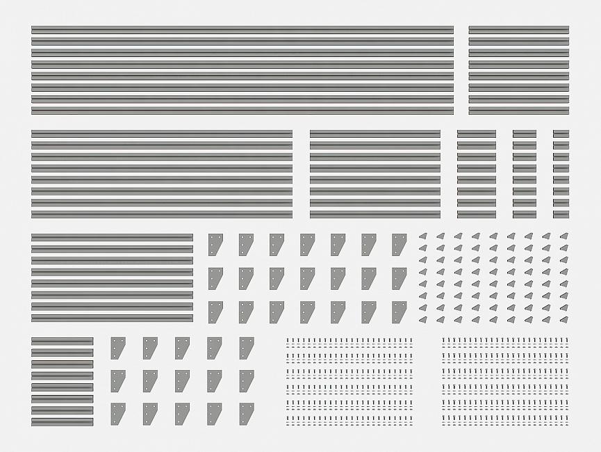 Набор состоит из алюминиевого профиля разной длины и крепежа, что позволяет создавать различные конструкции. Набор легко собирать и разбирать, поэтому заменить часть конструкции или полностью переделать ее не составит большого труда. Набор подойдет как для новичков, так и для опытных инженеров. Покупка набора выгодней на 10%.