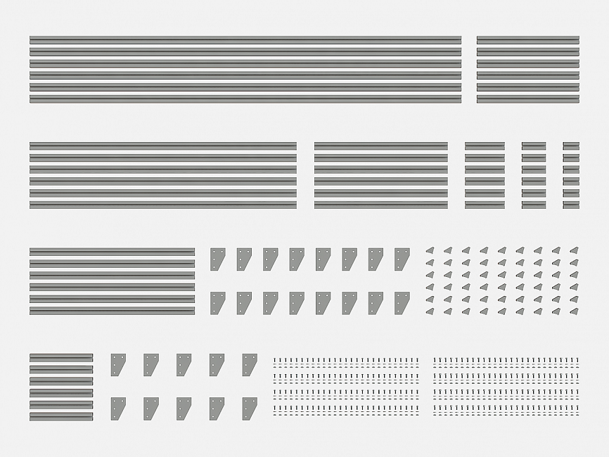 Набор состоит из алюминиевого профиля разной длины и крепежа, что позволяет создавать различные конструкции. Набор легко собирать и разбирать, поэтому заменить часть конструкции или полностью переделать ее не составит большого труда. Набор подойдет как для новичков, так и для опытных инженеров. Покупка набора выгодней на 10%.