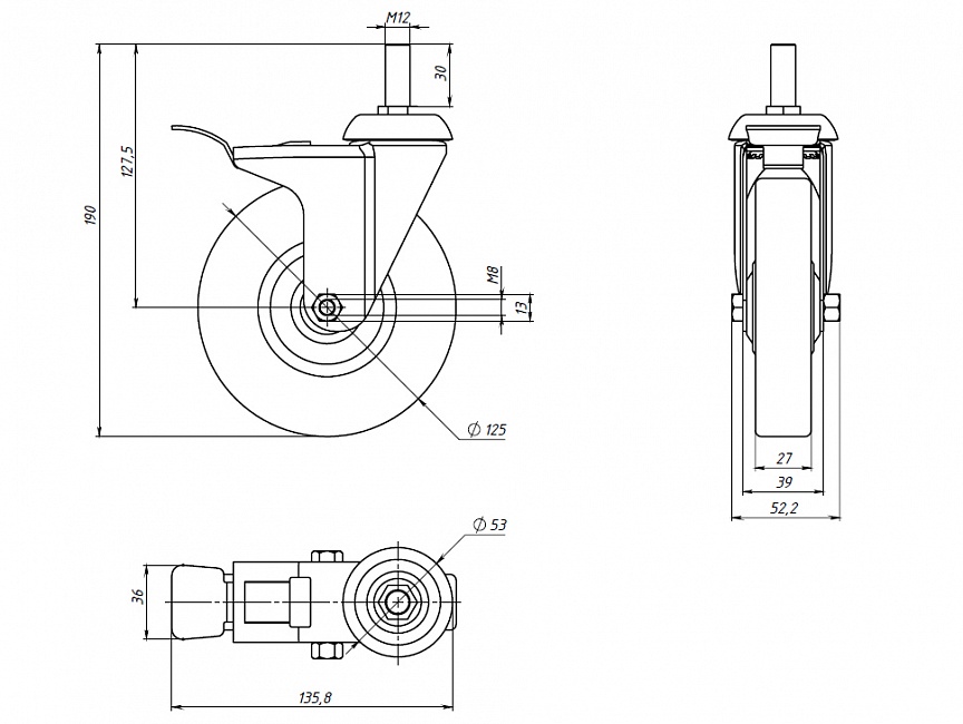 Колесо с тормозом Ø125 М12х30, A324 Арт. A324