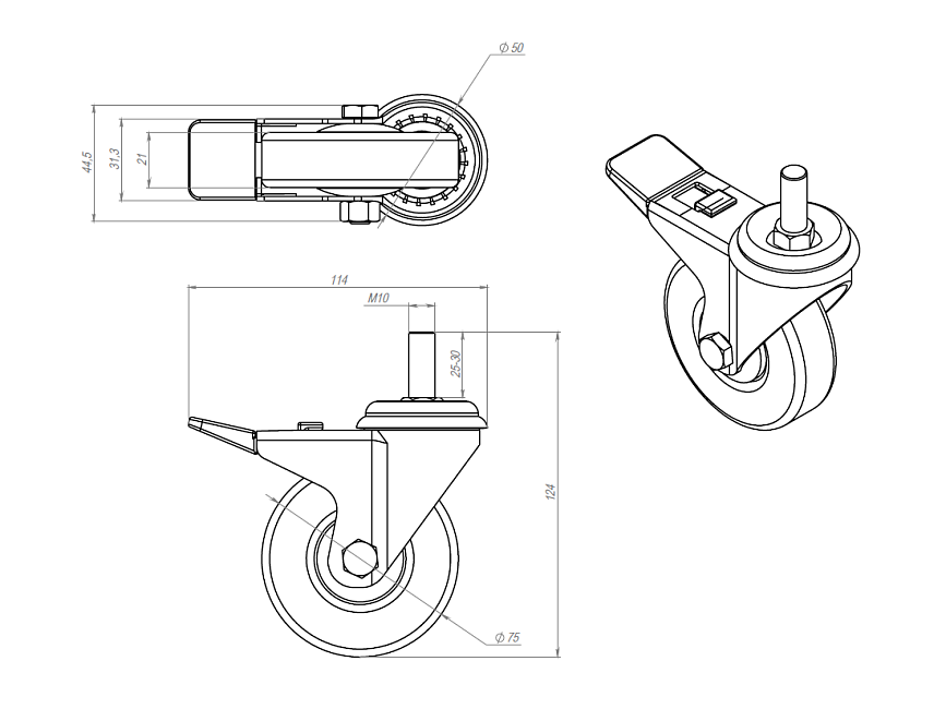 Колесо с тормозом Ø75 М10х25, A314 Арт. A314