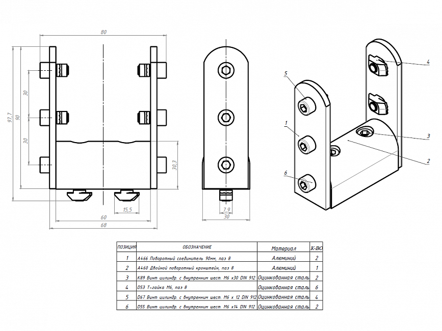 - Двойной поворотный кронштейн, паз 8, A460 — 1 шт