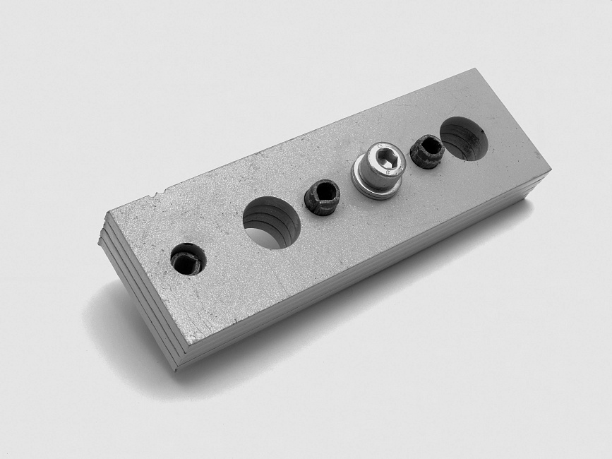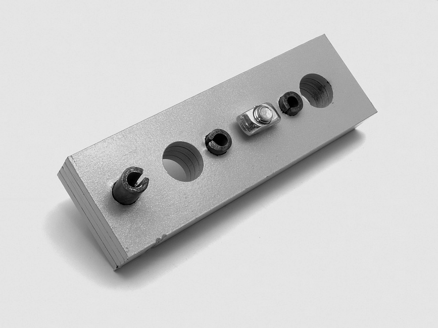 Кондуктор 45x45Б1 предназначен для сверления отверстий 17 мм при соединении двух конструкционных алюминиевых профилей серии 45 с помощью быстрых соединителей.