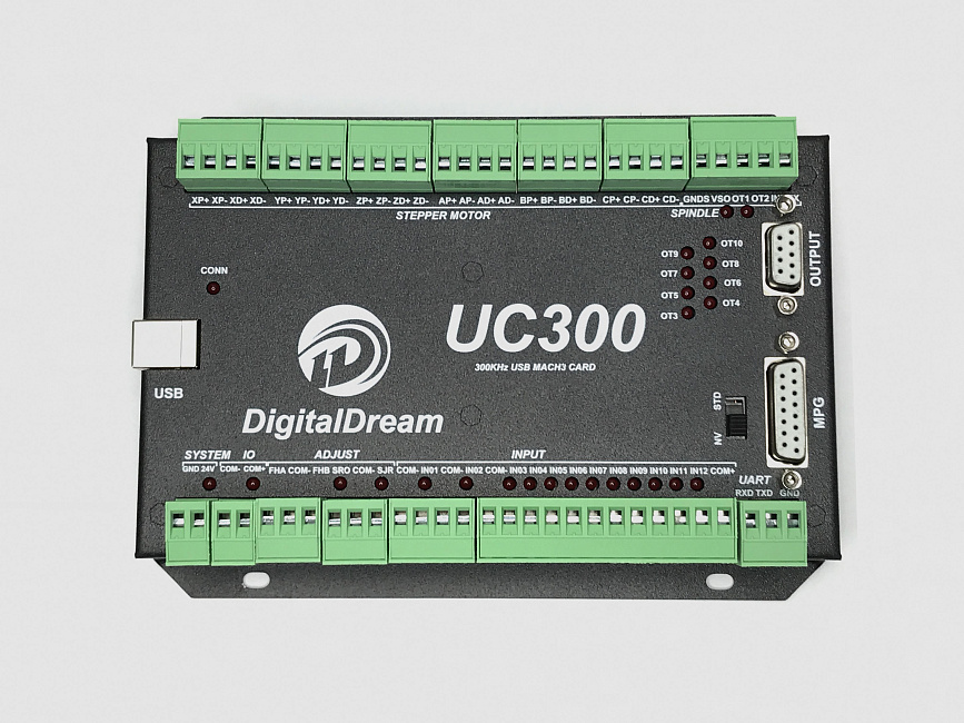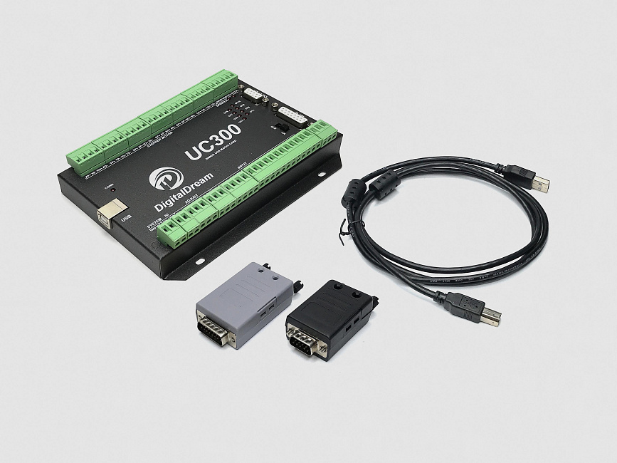 UC300-4 USB — компактный контроллер для станков с ЧПУ, поддерживающий управление четырьмя осями (XYZA). Работает с шаговыми моторами и серводвигателями по протоколам STEP/DIR и SPI. Управляется через USB-интерфейс, загружает файлы g-code автономно. Имеет систему самодиагностики и поддержку датчиков положения. Прост в установке и удобен для начинающих и опытных пользователей.