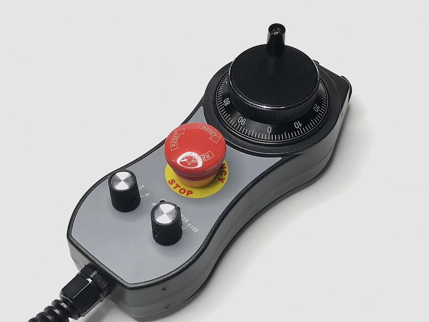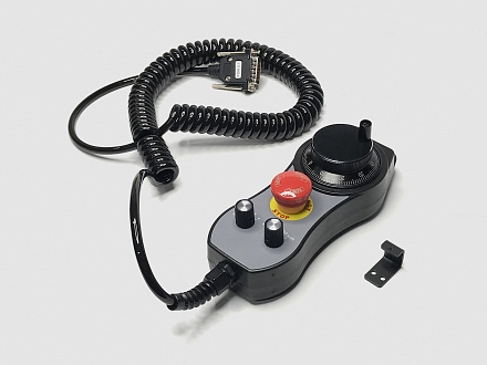 Портативный 4-осевой контроллер для станков с ЧПУ, совместимый с контроллером DDCSV3.1. Пульт обеспечивает гибкое ручное управление с выбором оси (X, Y, Z, 4-я) и переключателем шага (x1, x10, x100) для точного позиционирования. Оснащен грибковой кнопкой аварийной остановки, светодиодной индикацией состояния и имеет магнитное основание для удобного размещения на металлических поверхностях станка. В комплект входит экранированный кабель длиной около 2 м.