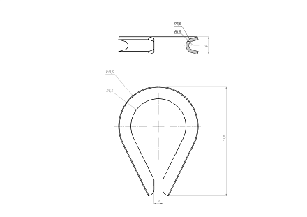 Данная модель коуша выполнена в виде капли. Представляет собой стальную пластину с загнутыми краями. Может быть пригоден для использования со стальными тросами или растительными и синтетическими канатами и веревками.