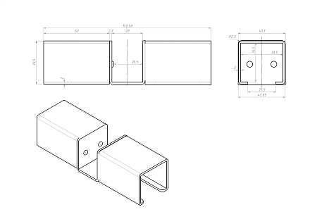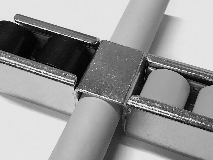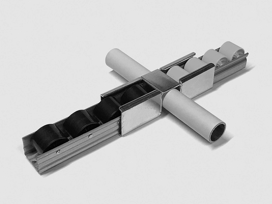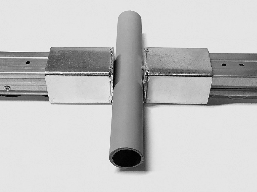 Кронштейн для алюминиевой направляющей тип E используется совместно в модульной трубной системе для установки роликовой направляющей на алюминиевую трубу D28 мм.