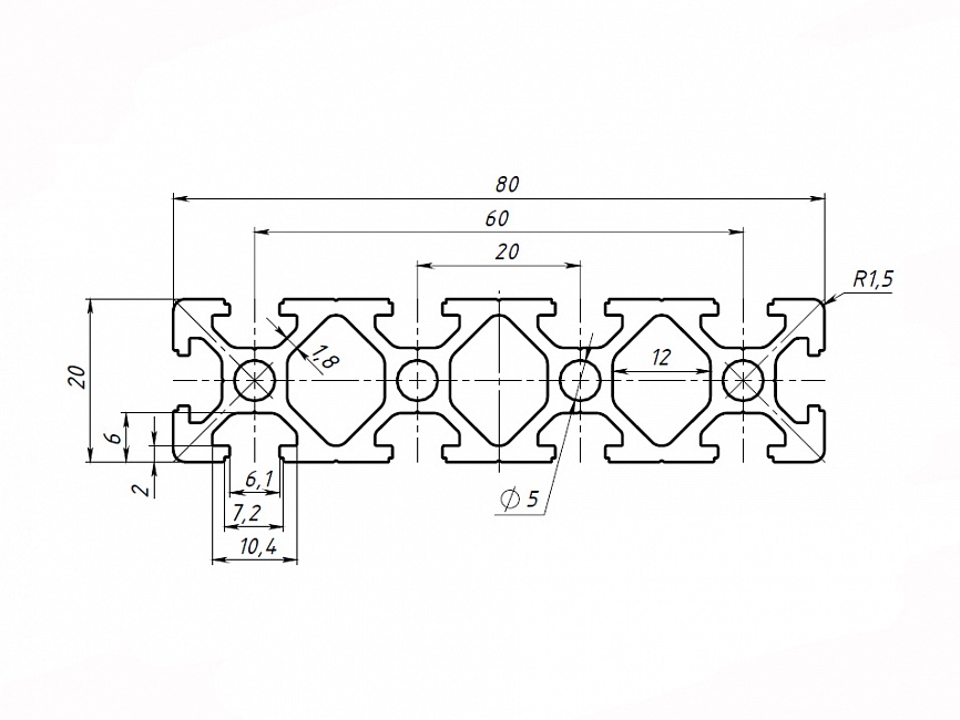 Алюминиевый профиль 20 серии с Т пазом 6 мм применяется для простых конструкций воспринимающих средние нагрузки. Также широко используется для создания выставочных стендов, легких дверей и перегородок, защитных ограждений, небольших лабораторных приборов и других конструкций. Профиль конструкционный 20х80SH отлично подойдет для домашних конструкций. Не рекомендуется использовать Т-гайки A128, A129, A130.