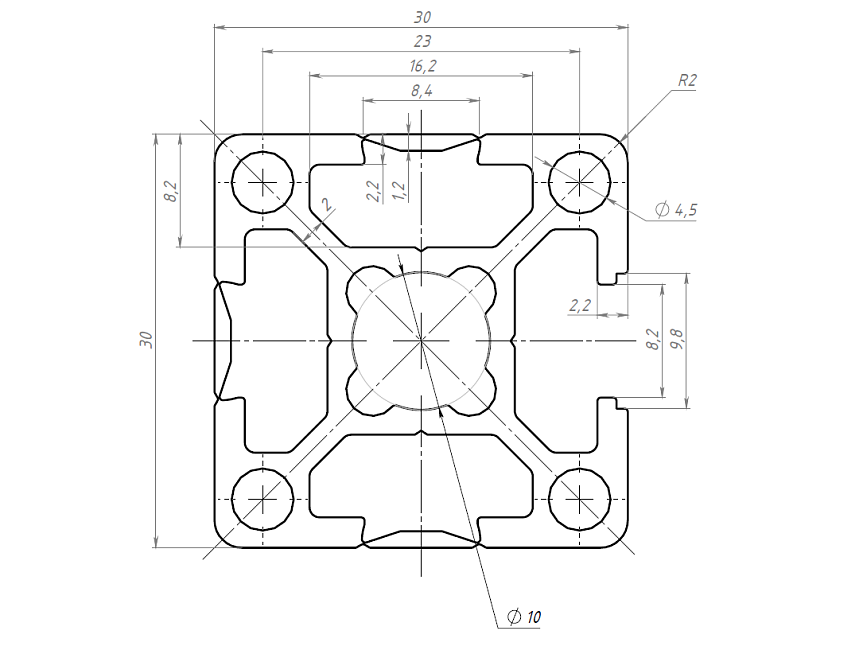 Алюминиевый профиль серии 30 с пазом 8 мм применяется для простых конструкций, воспринимающих средние нагрузки. Широко используется для создания выставочных стендов, легких дверей и перегородок, защитных ограждений, небольших лабораторных приборов и других конструкций. Профиль размером 30х30 может также использоваться для изготовления стеллажей и полок. Данная конфигурация профиля имеет три закрытых паза.