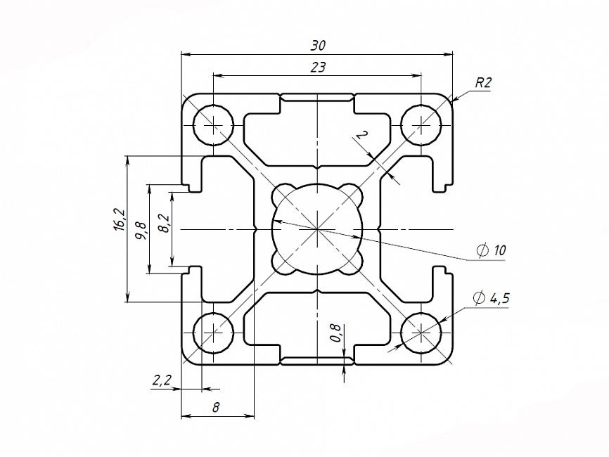 Алюминиевый профиль серии 30 с пазом 8 мм применяется для простых конструкций, воспринимающих средние нагрузки. Широко используется для создания выставочных стендов, легких дверей и перегородок, защитных ограждений, небольших лабораторных приборов и других конструкций. Профиль размером 30х30 может также использоваться для изготовления стеллажей и полок. Данная конфигурация профиля имеет два закрытых паза.