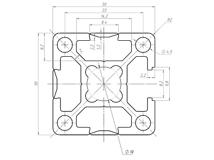 Алюминиевый профиль серии 30 с пазом 8 мм применяется для простых конструкций, воспринимающих средние нагрузки. Широко используется для создания выставочных стендов, легких дверей и перегородок, защитных ограждений, небольших лабораторных приборов и других конструкций. Профиль размером 30х30 может также использоваться для изготовления стеллажей и полок. Данная конфигурация профиля имеет три закрытых паза.