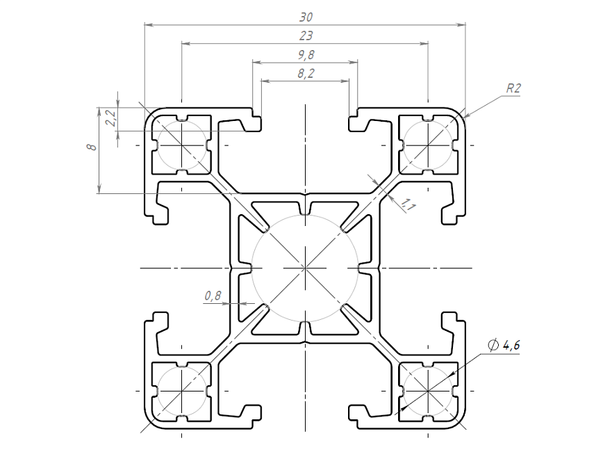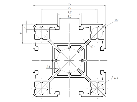 Алюминиевый профиль серии 30 с пазом 8 мм применяется для простых конструкций, воспринимающих средние нагрузки. Широко используется для создания выставочных стендов, легких дверей и перегородок, защитных ограждений, небольших лабораторных приборов и других конструкций. Профиль размером 30х30SLX может также использоваться для изготовления стеллажей и полок.