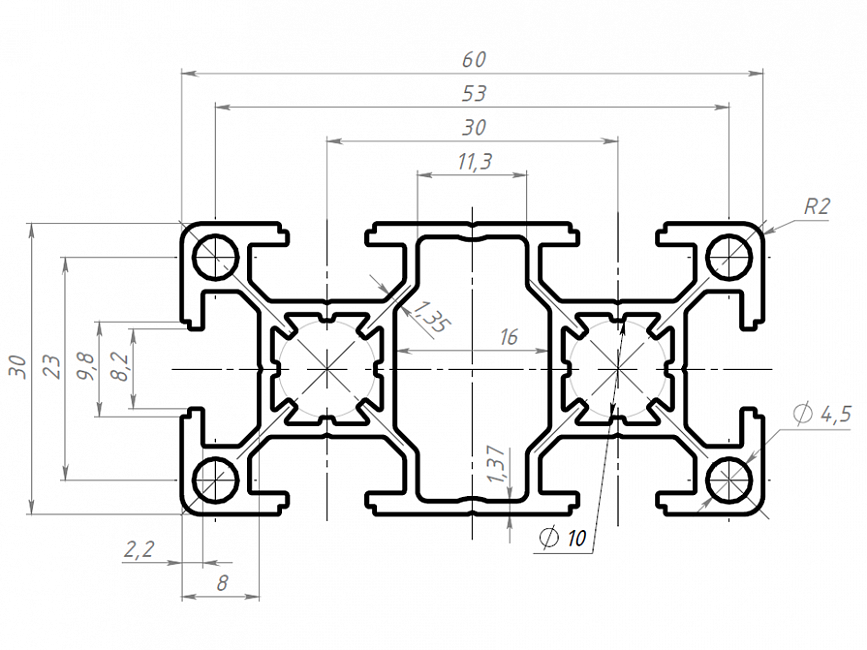 Алюминиевый профиль серии 30 с пазом 8 мм применяется для простых конструкций, воспринимающих средние нагрузки. Широко используется для создания выставочных стендов, легких дверей и перегородок, защитных ограждений, небольших лабораторных приборов и других конструкций. Профиль размером 30х60 может также использоваться для изготовления стеллажей и полок.