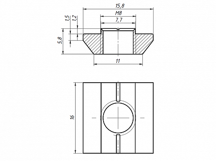 Сухарь пазовый вводится в паз с торца профиля и позволяет крепить к профилю различные дополнительные элементы и конструкции, используя болты и винты с соответствующей резьбой.