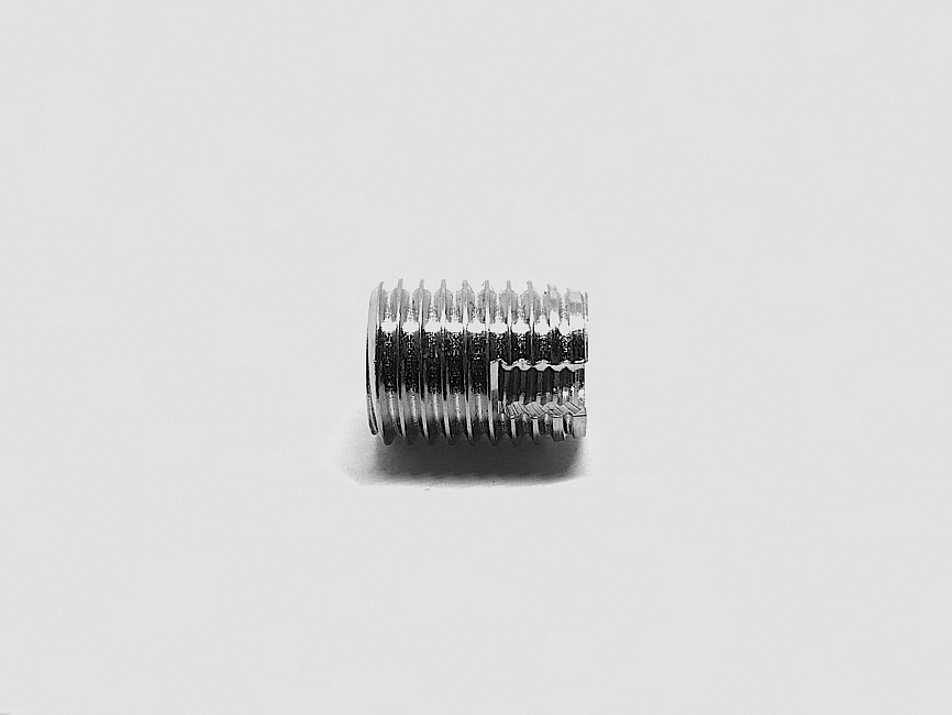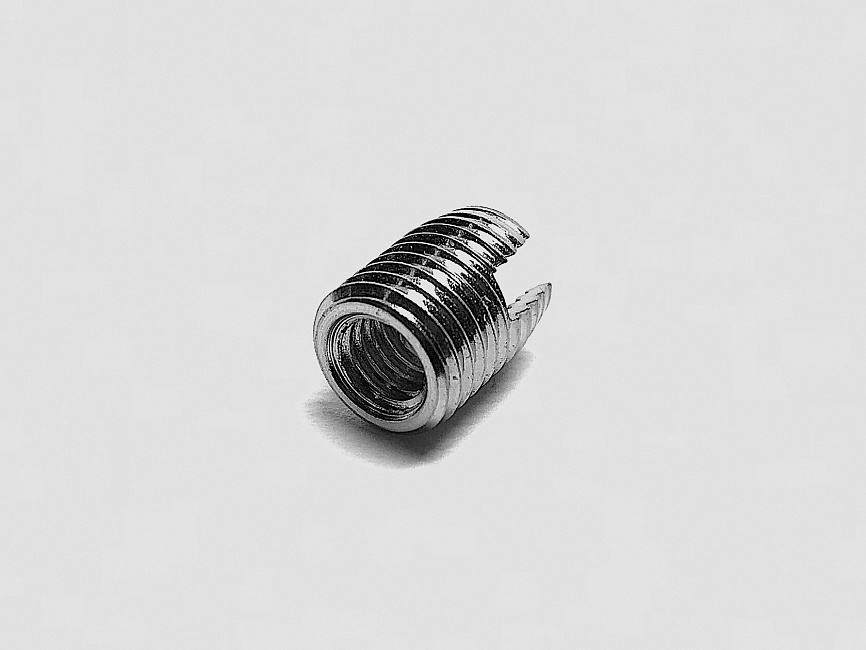 Монтаж самонарезающих втулок требует предварительного рассверливания отверстия сверлом диаметром 6,5 мм. Установку выполняют при помощи ручного монтажного инструмента, состоящего из винта, пары шестигранных гаек и шестигранного ключа. В профессиональной сфере для этих целей зачастую применяют специальный ключ для установки самонарезных втулок. В изделии используется основной шаг внутренней и внешней резьбы.